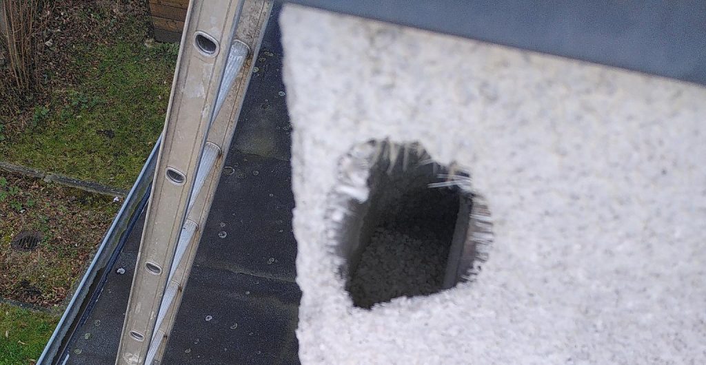Die Spechtlöcher werden repariert, indem die Dämmung aufgefüllt, ein Vogelschutzgitter eingesetzt und die Fassade anschließend verputzt wird. Aus dem unschönen Loch wird wieder vollwertig gedämmte Fassade.