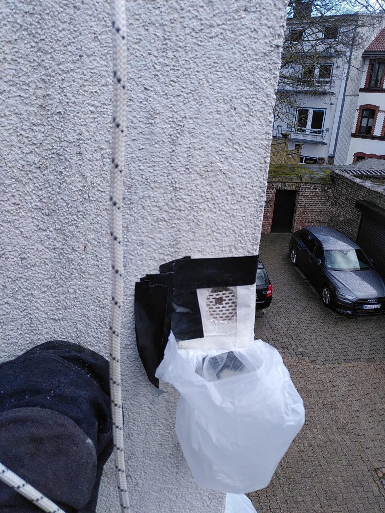 Wir setzten ein Vogelschutzgitter ein um ein erneutes Öffnen der Fassade an dieser Stelle zu erschweren.